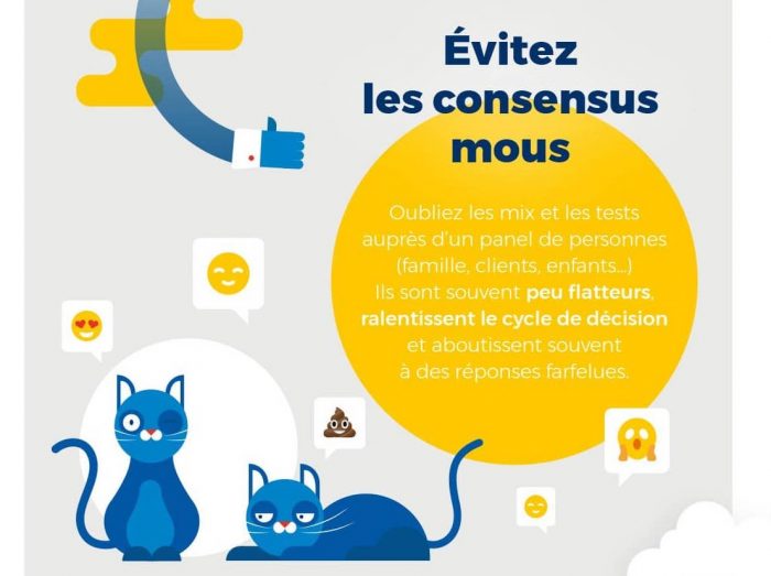 Craignant de se tromper, certaines marques ont recours à des panels d’individus pour tester leur identité ou pour donner des idées quant aux éléments visuels. Certes, ils peuvent parfois aider mais le plus souvent, ils sont source d’hésitation et conduisent à des décisions farfelues.
