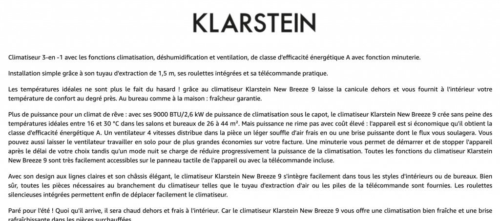 Il est donc crucial de miser sur cet élément de votre fiche produit. Amazon vous permet de rédiger jusqu’à 2000 caractères(environ 250 mots). Essayez donc de vous en approcher tout en restant clair, concis et original.