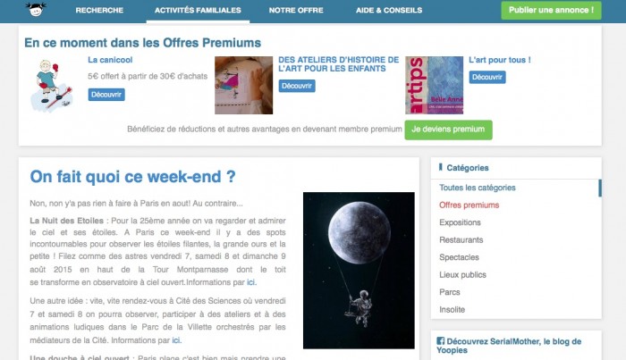 Pour sa création de contenu, Yoopies utilise entre autre une rubrique nommée “Activités familiales”. Cette rubrique comprend de nombreux articles afin d’aider les parents dans leur quotidien, mais aussi leur donner des idées pratiques comme des sortie avec leurs enfants.