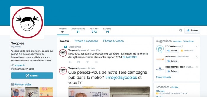 Sur Twitter, Yoopies est également présent et suivi par 371 followers. La stratégie est différente par rapport à Facebook, puisque c’est bien le site Yoopies qui est représenté, les tweets sont principalement axés sur du partage d’actualités concernant l’entreprise et son marché.