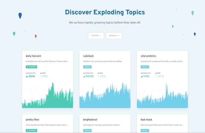 Exploding Topics est une sorte de Google Trends, que nous aurions pu citer dans cette liste… L’outil affiche des prévisions de tendances. Quels seront les sujets phares de demain ? Vous le saurez grâce à Exploding Topics ! Vous pourrez donc repérer des mots-clés sur lesquels vous positionner en avance, pour dépasser vos concurrents.
