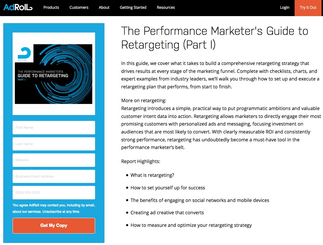 Sinon, à défaut de donner un véritable aperçu du livre blanc, décrivez autant que possible son contenu et surtout ses bénéfices pour le lecteur, comme le fait AdRoll pour ce livre blanc :
