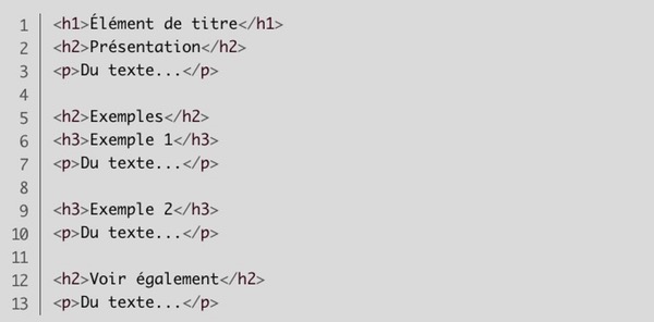 D’autres utilisent les balises <h4> à <h6> pour une question de style, mais n’oubliez pas : ces balises ont pour vocation de délimiter l’importance de vos différentes sections. Si vous souhaitez styliser certains titres ou expressions, il convient de passer par le CSS.