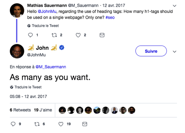 Concernant le nombre de <h1> à utiliser dans une page web ou un article de blog, la question fait débat. John Mueller, webmaster trends analyst chez Google, a indiqué dans un tweet en 2017 que ce nombre dépendait, laissant ainsi clairement apparaître qu’il n’y avait aucune règle à ce sujet.
