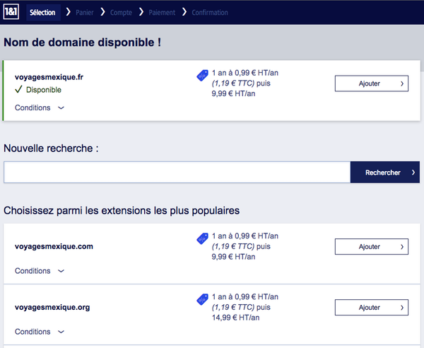 Après avoir cliqué sur “Rechercher”, vous pouvez voir si votre nom de domaine est disponible. L’hébergeur vous propose également votre nom de domaine avec différentes extensions.