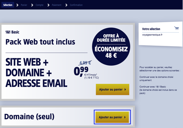 Choisissez le nom de domaine souhaité en cliquant sur “Ajouter” puis sur “Choisir”, à droite de votre écran. Vous pouvez ensuite sélectionner “Domaine seul”.