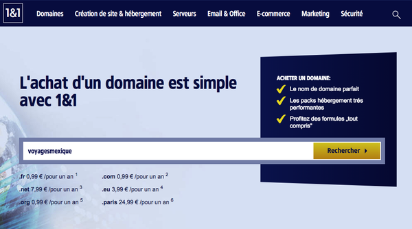 Prenons l’exemple de l’hébergeur 1and1.fr, simple d’utilisation. Rendez vous sur 1and1.fr/domaine-achat et recherchez le nom de domaine que vous voulez acheter.