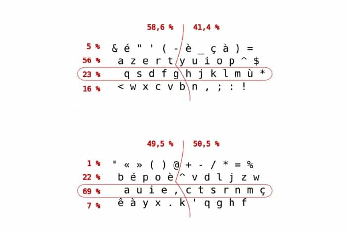 Comme vous pouvez le constater sur l’image, 69 % de la frappe se fait sur la ligne de repos, contre 23 % pour un clavier AZERTY.