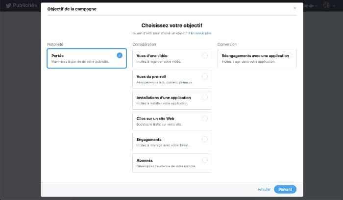Une fois votre choix fait, Twitter vous questionnera pour obtenir des détails sur votre nouvelle campagne publicitaire.