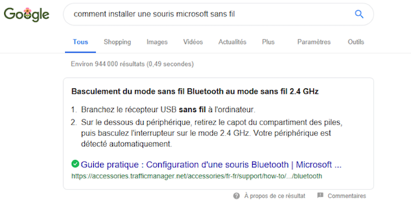 Par exemple ici, pour la requête : “Comment installer une souris Microsoft sans fil ?”, la position zéro est occupée par Microsoft et son guide de maintenance à destination des utilisateurs. Le contenu répond clairement à la demande puisqu’il s’agit d’un tutoriel.