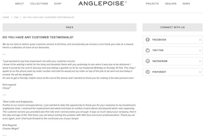 Le site Anglepoise est allé jusqu’à inclure une question intitulée “Avez-vous des témoignages clients ?” dans sa FAQ :