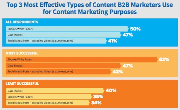 Les marketeurs ayant le plus de réussite donnent également le même classement, tout en en accordant plus d’importance aux e-books et livres blancs.