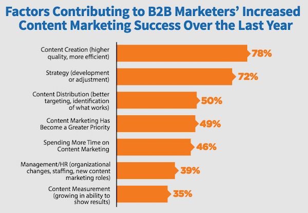Parmi les autres facteurs de succès, on retrouve l’amélioration de la distribution et de la promotion du contenu, la plus grande priorité accordée au content marketing ou encore les changements organisationnels allant dans ce sens.