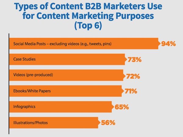 Ce graphique, qui révèle les 6 types de contenus les plus utilisées pour le content marketing en B2B, nous apprend que les publications sur les réseaux sociaux (hors vidéos) sont les plus populaires, du tweet au post Facebook en passant par l’épingle sur Pinterest.