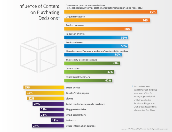 Si la source d’information qui influence le plus l’intention d’achat est le bouche à oreille, le marketing de contenu n’est pas très loin.