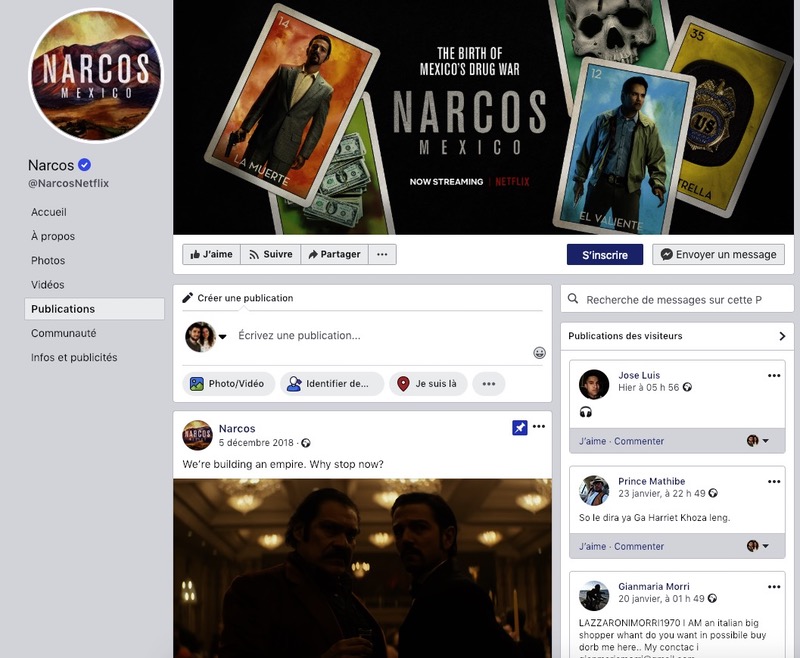 Pour la série Narcos, Netflix a créé une page Facebook spécialement dédiée à la promotion. On y retrouve des informations sur la vie d’Escobar, des interviews des acteurs principaux, etc. Bref, tout ce qui peut intéresser les fans de la série.