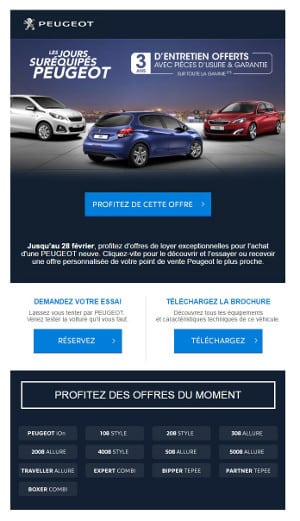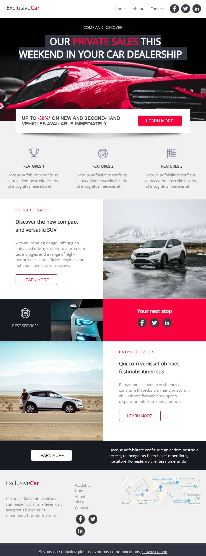 - Les e-mails commerciaux pour annoncer des promotions, l’arrivée de nouveaux véhicules ou de nouveaux produits, l’annonce d’une opération spéciale dans votre concession ou dans votre garage…