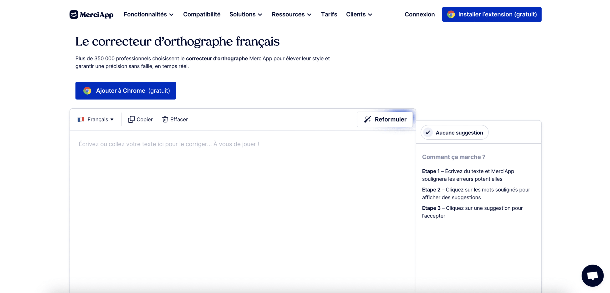Nombre de mots limité à 360 caractères. L’outil est gratuit, mais si vous souhaitez faire corriger des textes plus longs, une offre payante est disponible.