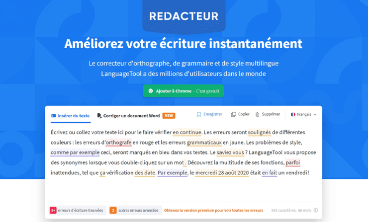 C’est là sa principale qualité : son fonctionnement en temps réel. Les erreurs sont surlignées : il vous suffit de cliquer sur les mots pour avoir la correction. Vous pouvez ajouter le correcteur en tant qu’extension Chrome, et ce, gratuitement. Voilà un atout important pour langage Tool, d’autant plus si vous ne travaillez pas habituellement sous Word, mais plutôt directement dans un CMS de type WordPress.