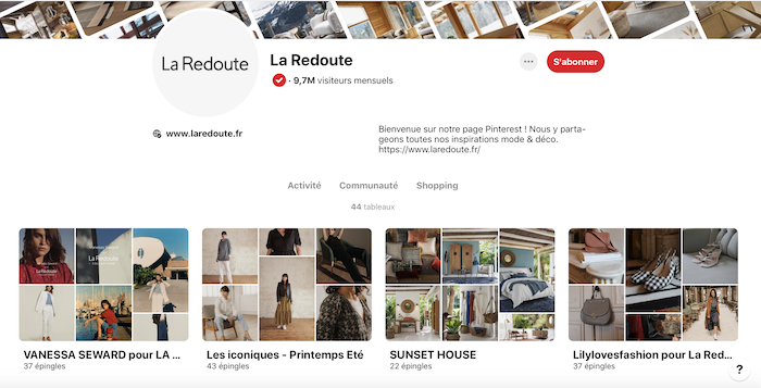 Une fois que vous avez complété votre profil, vous pouvez commencer à créer des tableaux qui sont des sélections de visuels. Privilégiez les images de qualité et faites des tableaux cohérents. Si vous vous rendez sur Pinterest, intéressez-vous au profil de La Redoute.