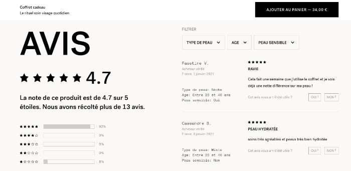 Si les clients peuvent noter ou donner leur avis sur vos produits, il est intéressant de les faire apparaître. Aujourd’hui, une grande majorité des consommateurs vérifient les avis avant de procéder à un achat. Sachez qu’il n’est pas rare de voir la note globale attribuée directement après la dénomination.