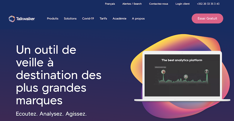 Si vous désirez profiter d’un outil simple à prendre en main pour surveiller l’e-réputation de votre entreprise, Talkwalker arrive lui aussi en bonne position. Toutefois, sans débourser le moindre euro, les fonctionnalités à votre disposition seront des plus limitées…