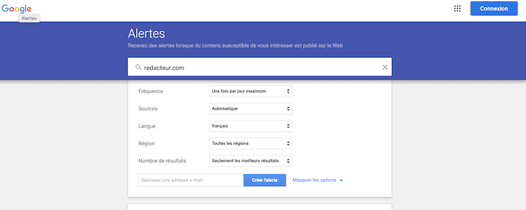 Il suffit effectivement de paramétrer le nom d’une entreprise, une marque, une thématique ou une expression et Google Alerts vous notifie les publications qui y font référence, et ce par mail.
