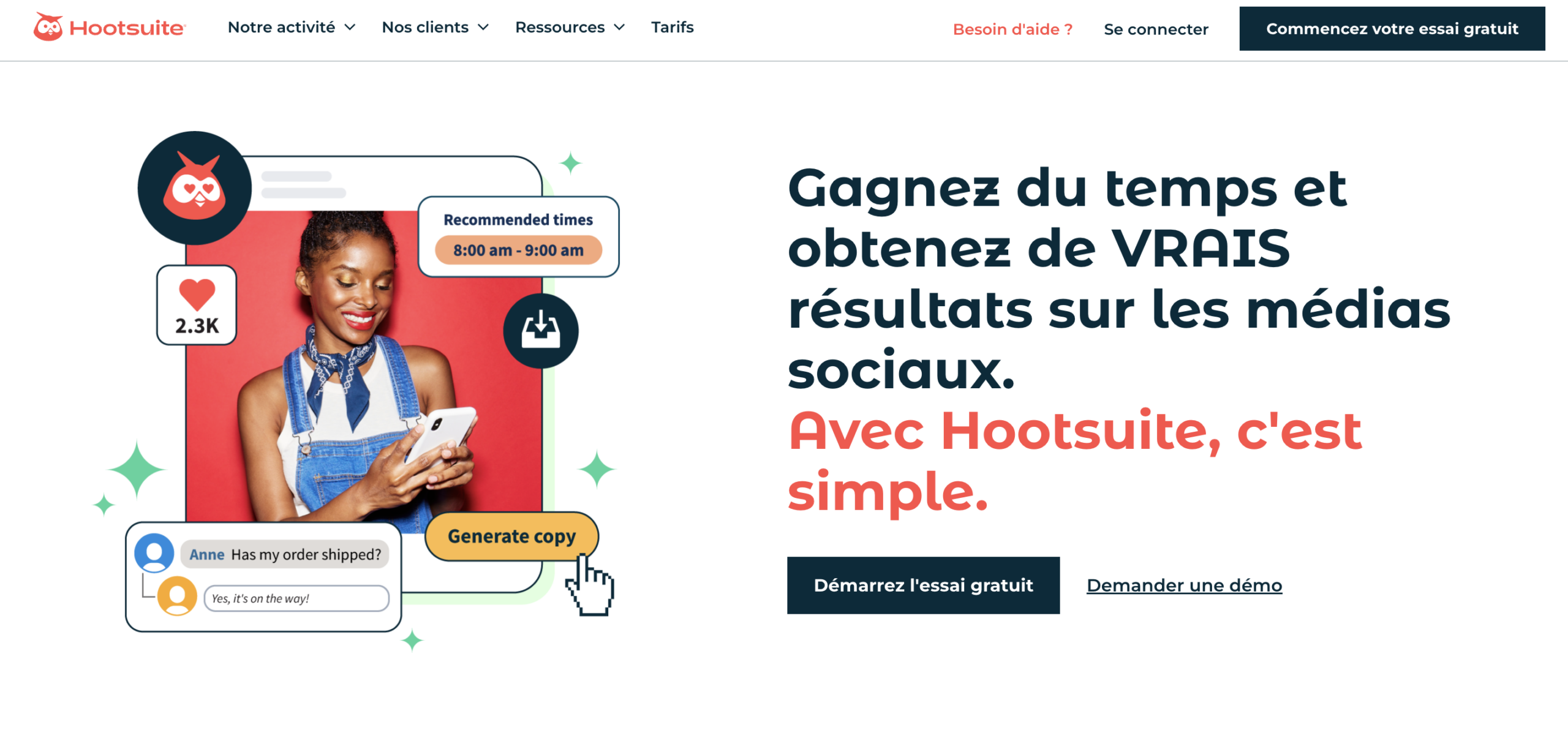 Il vous permet de répondre directement aux contenus laissés par vos clients. Facile à utiliser, Hootsuite se distingue par sa performance.