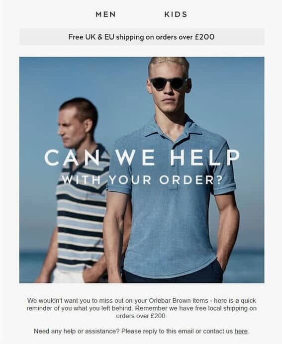 Certaines marques relancent leurs clients qui ont abandonné un panier achat. Dans ce cas, le message qui accompagne le mail, la photo du produit en rappel et le bouton « Call to action » sont essentiels à insérer dans le corps du texte.