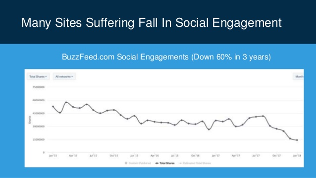 L’engagement sur les réseaux sociaux est en diminution depuis maintenant plusieurs années, comme l’illustre BuzzFeed, dont l’engagement a chuté de 60 % en 3 ans :