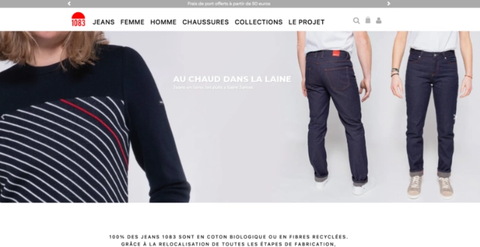Ici, le chiffre affiché suscite forcément de la curiosité. Le visiteur cherche à comprendre la référence et l’explication tombe assez rapidement sur la page d’accueil : 1083 désigne le nombre de kilomètres qui séparent les deux villes de France les plus éloignées, et donc la distance maximale que peut parcourir un jean 1083 made in France, entre son lieu de fabrication et son lieu de commande.