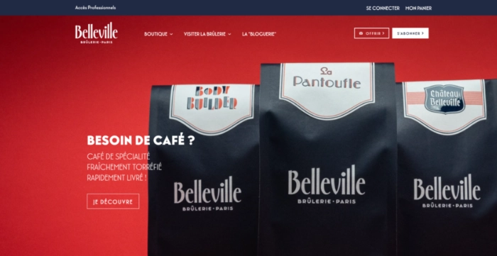 Le site des cafés Belleville est à mettre en avant également pour son design travaillé. Vous plongez dans l’univers Belleville sur toutes les pages : les visuels, les couleurs et les polices utilisés portent tous le branding maîtrisé de la marque.