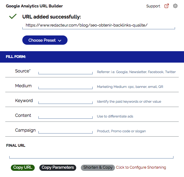 Pour utiliser cette extension gratuite il vous suffit de cliquer sur son icône. L’outil récupère automatiquement l’URL de la page web en question et vous génère l’URL finale après que vous ayez rempli un court questionnaire.