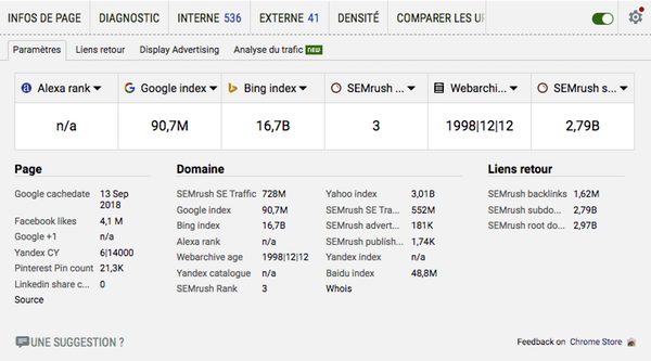 Vous pourrez également visualiser le nombre de liens externes que possède votre page web.