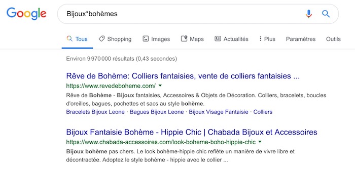 Avec l’exemple Bijoux*bohèmes, vous accédez à une palette de propositions comme : Bijoux bohèmes argent, Bijoux bohèmes mariage, Bijoux bohèmes ethniques, et ainsi de suite.