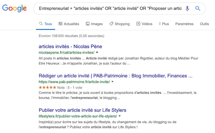 Si votre domaine est l’entrepreneuriat, vous indiquez dans le moteur de recherche la combinaison suivante : Entrepreneuriat + “articles invités” OR “article invité” OR “Proposer un article” OR “Écrire un article invité” OR “devenir rédacteur” OR “publiez vos articles” OR “publiez un article” OR “Guest Blogging” OR “publiez ici” OR “Proposez un article” OR “devenir redacteur” OR “devenez redacteur”