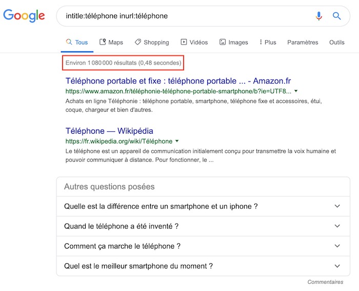 Ce procédé contraint Google à ne cibler que les résultats qui comprennent le mot téléphone dans le titre de la page ou dans l’URL. Par conséquent, le nombre de résultats proposés diminue drastiquement.