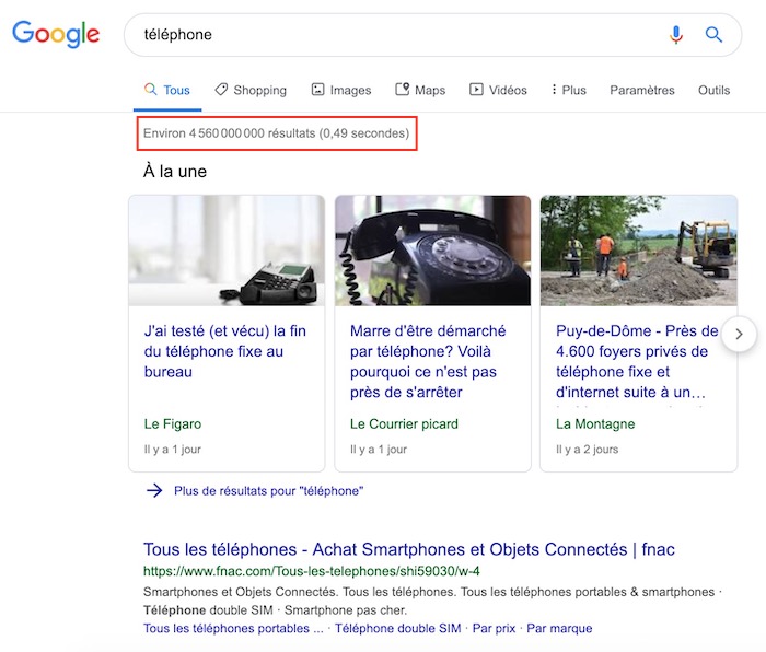 Pour résoudre ce problème, Google permet désormais l’intégration d’opérateurs afin d’obtenir une recherche ciblée. Si un internaute tape le terme “téléphone”, il s’agit d’une requête large où plusieurs millions de résultats apparaissent.