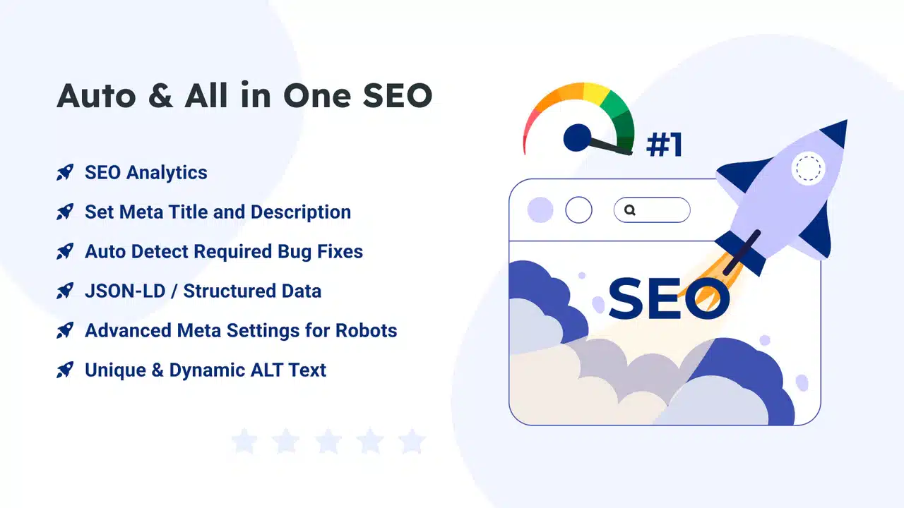 All in One & Auto SEO est une boîte à outils qui va scanner votre site e-commerce et analyser vos problèmes de référencement. Le plugin est en essai gratuit de 7 jours, puis passe à moins de 8,99 € mensuel.