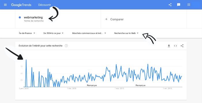 Nous avons recherché ici le terme webmarketing dans la catégorie marchés commerciaux et industriels, en Ile-de-France, depuis 2004 et en recherche sur le web.