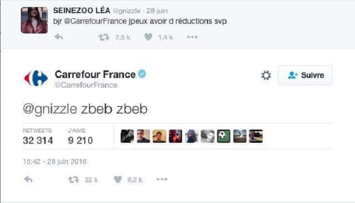 Parmi les exemples à ne pas suivre, la réponse déplacée et insultante du community manager de Carrefour qui reprend à son actif une réplique popularisée par un individu peu recommandable.