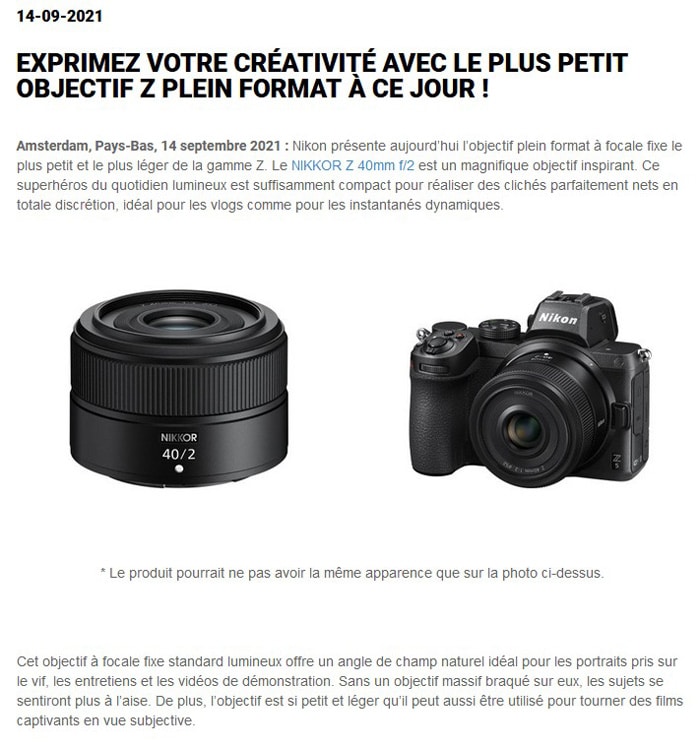 2. L’article de presse de Nikon pour promouvoir un nouveau produit