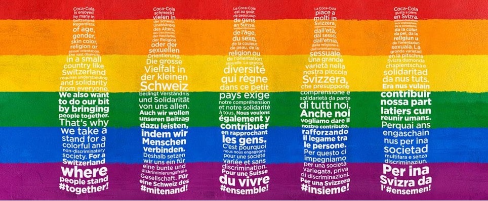 Quand les grandes marques cherchent à transmettre une image de marque corporate, ça donne de superbes campagnes marketing. Ce manifeste de Coca-Cola Suisse est fédérateur et inspirant. La célèbre marque affirme son engagement pour un vivre ensemble, sans discrimination. Résultat : Coca est perçu comme une marque éthique où la tolérance n’est pas un vain mot. Pari gagné !