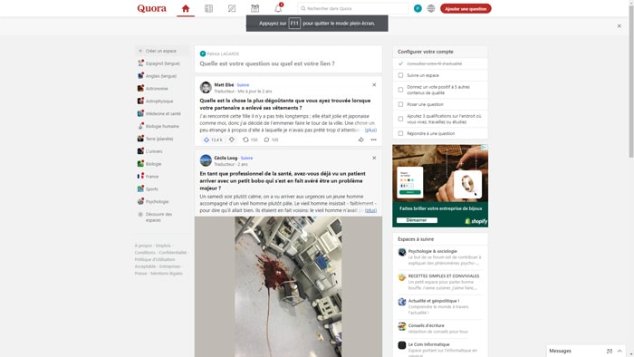 Quora est une plateforme très active où les internautes peuvent poser des questions, recevoir des réponses et répondre aux interrogations des autres utilisateurs.