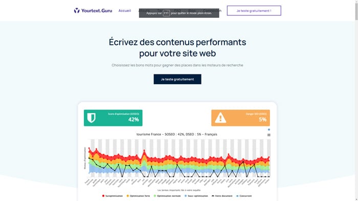 Yourtext.guru est un outil d’aide à la rédaction web qui va vous permettre d’améliorer votre contenu jusqu’à ce qu’il réponde parfaitement aux attentes des moteurs de recherche.