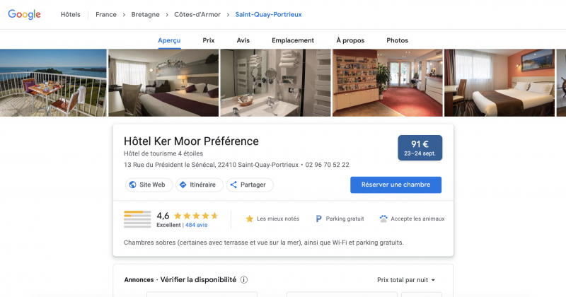 L’objectif est d’encourager les clients potentiels à cliquer sur « visiter le site web », « appeler » ou « réserver » directement à partir de la recherche.
