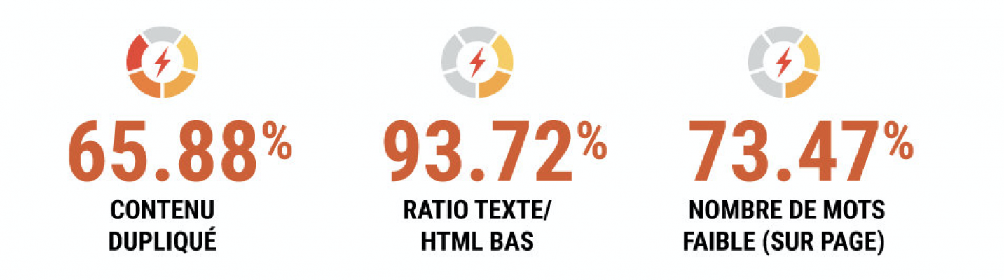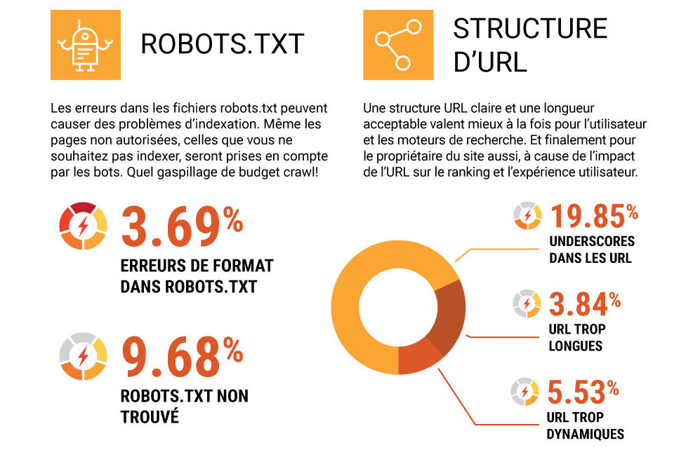 Pour autant, des underscores sont trouvés dans près de 20 % des URLs alors que 5 % sont trop dynamiques et 4 % sont trop longues.