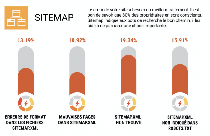 Entre les erreurs de format très problématiques dans ce fichier (3,69 % des cas) et la difficulté pour les robots Google de le trouver (environ 10 % des sites), voilà de quoi causer de vrais problèmes d’indexation.
