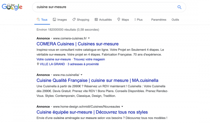 - Une meilleure valorisation des produits pour la simple et bonne raison que les résultats Adwords permettent d’afficher des photos là où les résultats organiques se contentent de contenir du texte.