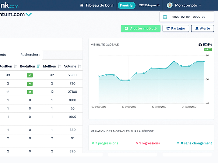 Analyse de la concurrence, suivi de votre position quotidienne dans la SERP et de votre évolution SEO, alertes mails dès qu’un changement de position intervient, etc.